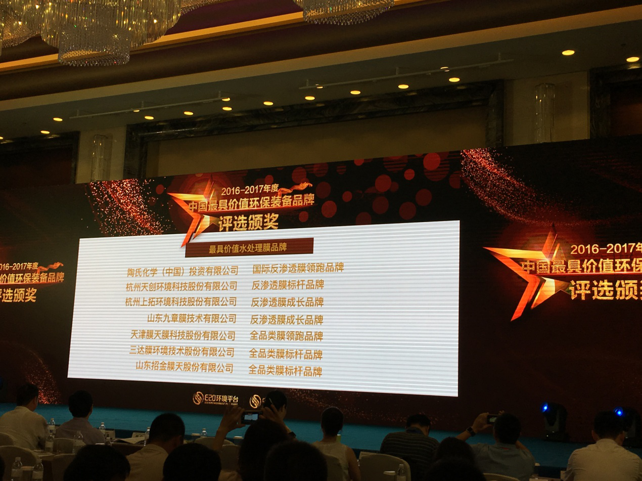2017年8月23日,由上海市政工程设计研究总院(集团)有限公司、上海城投污水处理有限公司、E20环境平台共同主办的2017(第九届)上海水业热点论坛在上海隆重举行,现场揭晓了“2016-2017”年度中国环保装备品牌的评选结果。天创环境凭借二十年的积累与沉淀,荣膺 “2016-2017”年度中国最具价值环保装备品牌——水处理膜品牌。