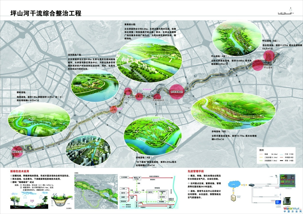 坪山河项目在政策引领、上位规划的基础上,创新性的提出了以水资源、水环境、水安全、水生态、水文化“五位一体”的治水理念和“治污、防洪、生态修复”+“城市建设”的“3+1”治水思路。