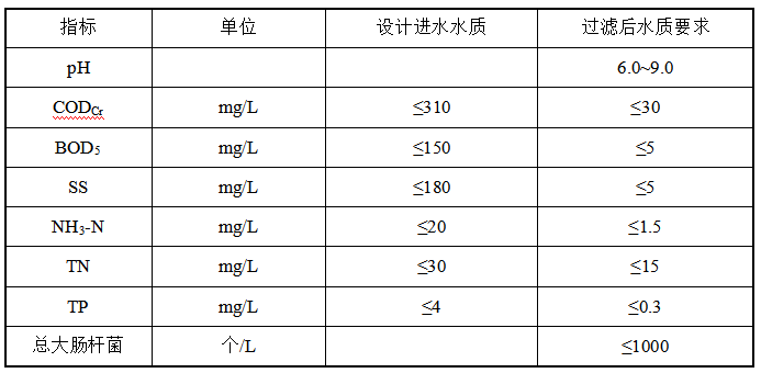 本项目MBR系统设计来水为生化池混合液。设计出水水质除TN执行一级A标准外,其余主要指标执行地表水Ⅳ类标准。