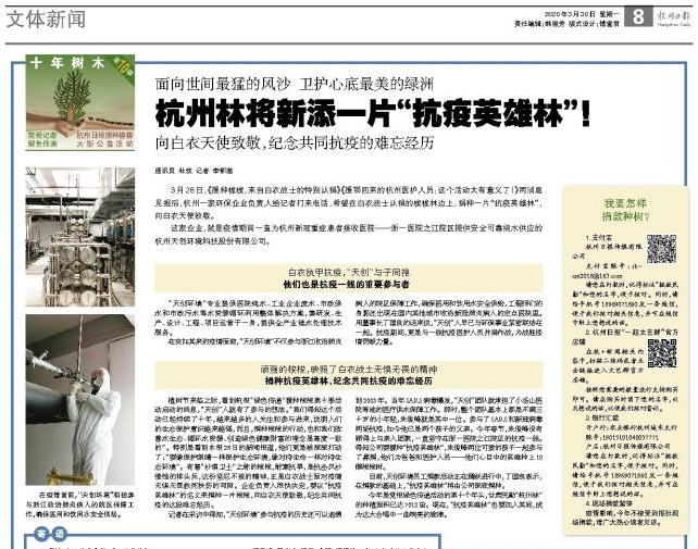 截至3月31日,天创环境员工捐款活动已告一段落。董事长丁国良表示,在捐款的基础上,“抗疫英雄林”将由公司保底捐种20亩。