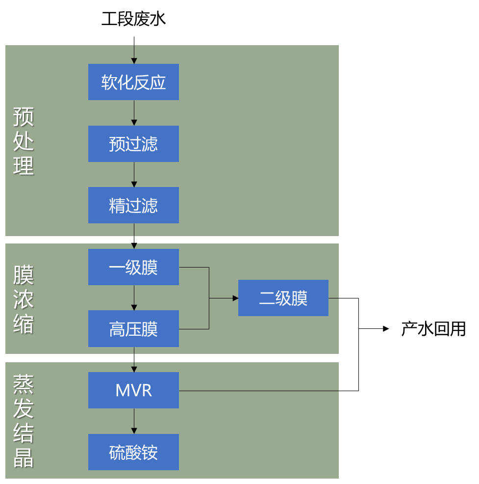 本项目采用天创独有的软化技术,在不引入外加离子的条件下,对来自生产工段的稀土碳沉硫酸铵废水进行除硬软化反应。料液经压滤、多级过滤后进入多级特种分离膜系统,浓缩液进入MVR蒸发结晶,产水进入回用水池达标回用。