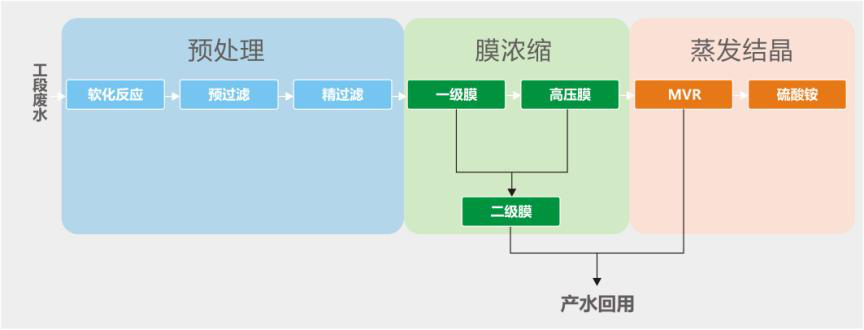 本项目采用天创独有的软化技术,在不引入外加离子的条件下,对来自生产工段的稀土碳沉硫酸铵废水进行除硬软化反应。料液经压滤、多级过滤后进入多级特种分离膜系统,浓缩液进入MVR蒸发结晶,产水进入回用水池达标回用。